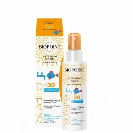 Latte spray solare protezione alta, facile da spalmare, non appiccicoso e molto resistente all’acqua.