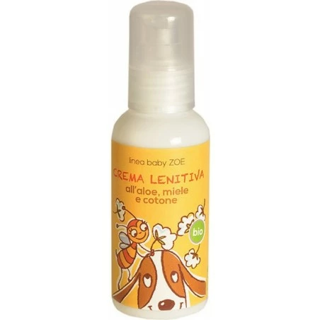 Crema idratante e lenitiva, ideale anche dopo punture insetti, scottature e come doposole. Grazie alle proprietà idratanti, protettive e lenitive dell’Aloe e del miele, abbinate a quelle nutrienti dell’estratto di cotone ed a quelle addolcenti e calmanti dell’estratto di camomilla fanno di questa crema un indispensabile alleato della delicata pelle del vostro bambino.MODO D’USO applicare almeno una volta al giorno una piccola quantità sul palmo della mano o direttamente sul corpo, massaggiando per pochi secondiPRINCIPI ATTIVI – Miele: emolliente e protettivo ideale per il trattamento di pelli screpolate, secche e sensibili. Efficace doposole – Cotone: Nutriente ricco di Vitamina E – Aloe: lenitivo dermoprotettivo, idratante ed emolliente. Ideale anche dopo punture insetti, scottature e come doposole – Burro di Karitè: emolliente, idratante, anti-secchezza cutanea anche in caso di dermatiti, eritemi solari, ustioni, rugosità, ulcerazioni, irritazioni e screpolature – Olio di Soia Selvatica: emollienteINGREDIENTS Aqua, aloe barbadensis leaf juice, butyrospermum parkii butter, glycine soja, caprylic/capric triglycerides, glycerin, ethylhexylsteararte, ceterayl alcohol, allantoina, glyceryl stearate, stearic acid, sodium lauroyl glutamate, gossypium extract, mel, propanediol, bisabolol, phenethyl alcohol, parfum, sodium phytate, undecyl alcohol, tocopheryl acetate.PACKAGING Flacone 100 ml