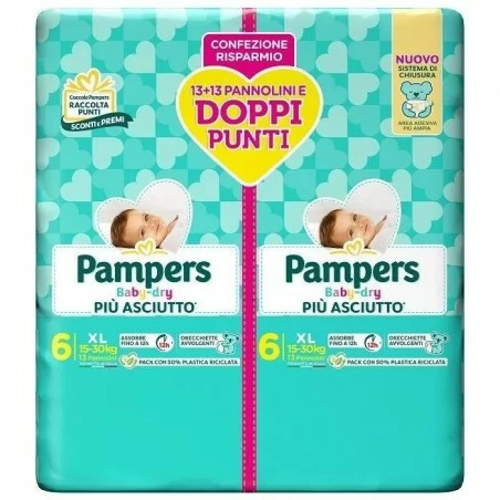 I pannolini Baby-Dry di Pampers, grazie alle orecchiette rinforzate avvolgono il bimbo come un koala, in più, grazie ad un cuore più assorbente, il bambino è ancora più asciutto, fino a 12h. Grazie alla struttura super assorbente e ai materiali traspiranti, Baby Dry blocca il bagnato lontano dalla pelle mentre lascia passare liberamente l’aria al suo interno per una naturale traspirabilità. Il pannolino è inoltre dotato di speciali barriere «tienitutto», di un filtrante assorbente con delicata lozione con Aloe e da una vestibilità super-avvolgente che non perde mai di vista il comfort.